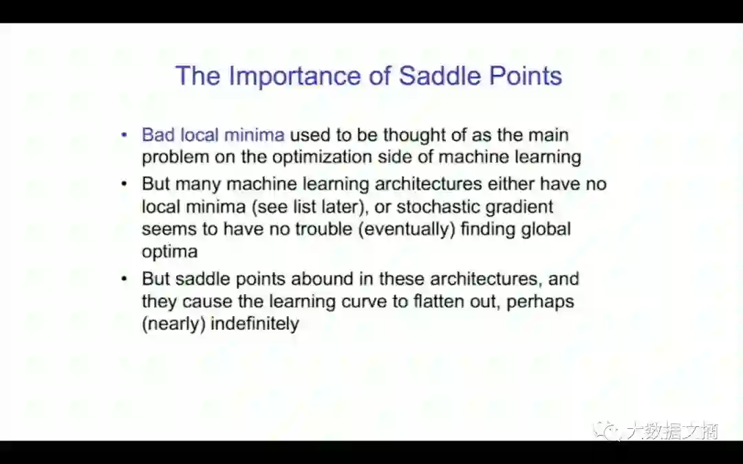 我要讲的是鞍点,以及如何有效地避开它们。你们都知道局部最小值是我们的克星,所以我一直在讨论这个问题,那就是如何避免局部最小值。但问题并不明显,有很多机器学习的问题没有局部最小值。即使你有局部最小值,梯度下降似乎可以轻松回避它们。神经网络如果足够大的话就会有足够的冗余,要做到这一点并不难。达到零就是全局最优解。这就是你们在实践中看到的。也许这并不是真正的问题。如果一个回路的局部最大值不是问题,它的鞍点是剩下需要解决的。