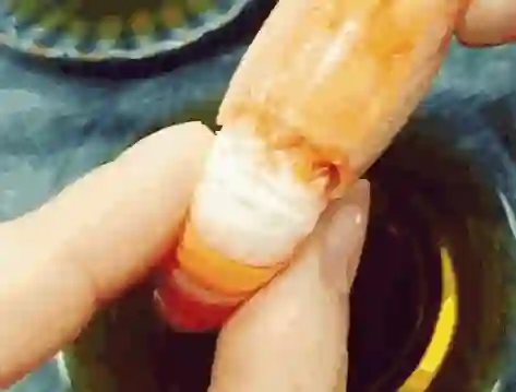 罗氏沼虾的壳十分轻薄,从虾腹轻轻一掰一扯就能轻松剥下: