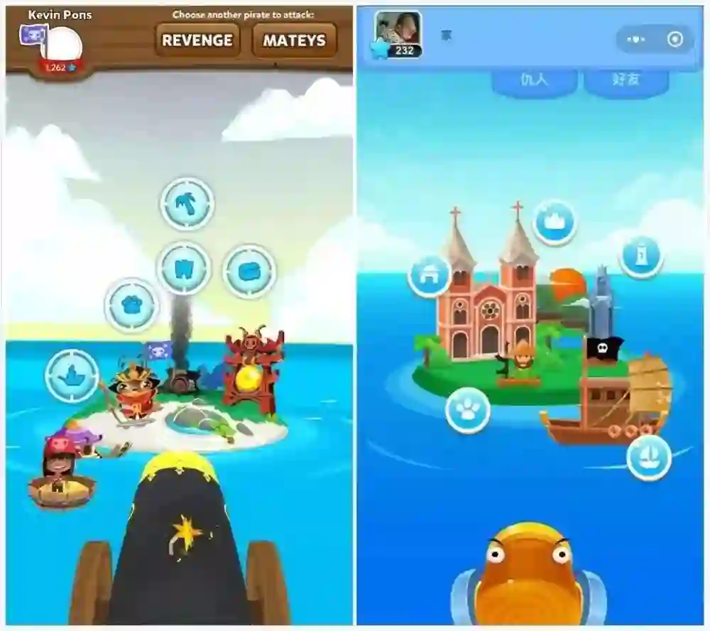 曹晓刚口中的“把经典单机游戏进行社交改造”是怎样实现的?我把这两个游戏都找来玩了一段时间,做了个简单的对比。下面的左图为2013年的《Pirate Kings》,右图为《海盗来了》。