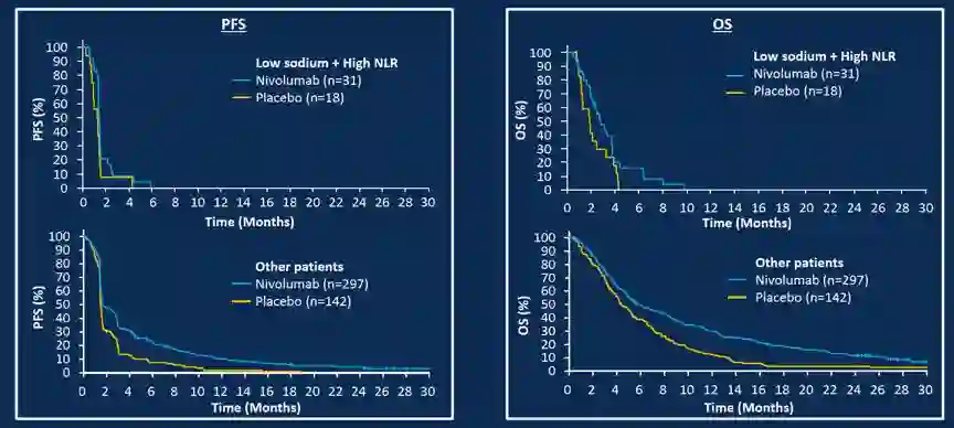 在配对因子分析中,低钠血症和以下任意一个因子组合,都是纳武利尤单抗早期进展的危险因素,包括高NLR(N = 31,9.4%;界值,第2三分位)、中性粒细胞升高(N = 28,8.5%;界值,第2三分位)、PS 1分 (N = 50,15.2%)或既往未使用过雷莫芦单抗(N = 55, 16.7%)。上述任意2个因素配对的患者中,纳武利尤单抗组和安慰剂组的PFS曲线几乎重叠。图2显示,同时存在低钠血症与高NLR两个因素,纳武利尤单抗组和安慰剂组的PFS和OS率只略有差别。