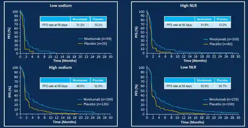 纳武利尤单抗组的330例患者,59例在基线时表现为低钠血症。单因素分析显示,低钠血症是预测早期进展的最强预测因素,如图1所示,低钠血症患者56天的PFS率对比,纳武利尤单抗组和安慰剂组分别为31.3%和10.2%。