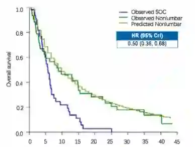 校正Flatiron Health数据库随机队列患者的协变量后,接受纳武利尤单抗治疗患者预估的生存期与CheckMate 032中实际观察到的生存期相似。基于模拟治疗比较法,接受纳武利尤单抗治疗预估的生存期对比Flatiron Health随机队列中观察到的生存期,提示纳武利尤单抗较标准治疗改善总生存(HR = 0.50;95% CI 0.36~0.68)(图5)。这与ATTRACTION-2研究中死亡风险降低37%的结果一致。鉴于尚无研究针对西方人群比较纳武利尤单抗与-标准治疗的随机对照研究,该研究的结果对于临床实践具有重要的启示意义。