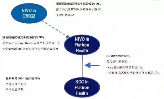 目前,尚无随机对照临床研究在二线或以上化疗耐药后的欧美胃癌/胃食管结合部癌患者中对比纳武利尤单抗与标准治疗的疗效。在基于亚洲人群的ATTRACTION-2研究中,纳武利尤单抗对比标准治疗的OS HR为0.63[6];然而,该亚洲患者结果是否同样适用于美国人群尚未可知。鉴于此,研究者尝试利用CheckMate-032研究(纳武利尤单抗的单臂Ⅰ/Ⅱ期在胃癌的研究)的个体患者数据(数据集1)与Flatiron Health电子健康数据库(数据集2)中接受现有标准治疗的患者数据采用模拟治疗比较法进行对比,旨在既往接受过二线或以上化疗的美国晚期/转移性胃癌或胃食管结合部癌患者中,评估纳武利尤单抗相比于现有标准治疗的生存优势。模拟治疗比较的方法学总结见图4,将Flatiron Health数据库中接受标准治疗的人群所观察到的OS和假设将纳武利尤单抗用于Flatiron Health人群所预估的OS进行比较。
