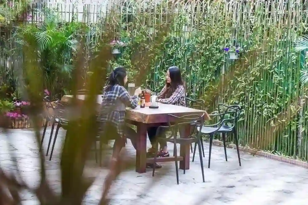 推开门后,你会发现里面别有洞天:竹栅栏围成的小院子、淡绿色的建筑外墙,二楼的阳台上摆满了各种盆栽植物。