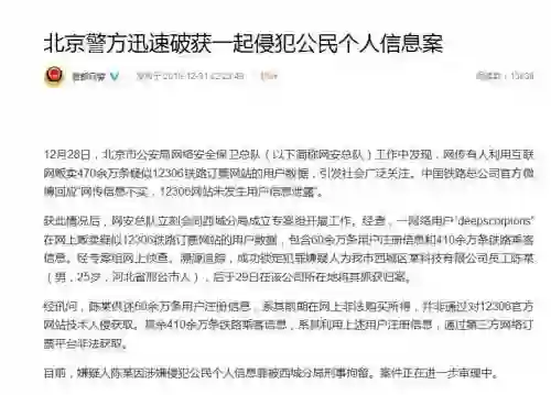 据北京市公安局网络安全保卫总队微博消息,北京警方破获一起侵犯公民个人信息案,网上贩卖 470 余万条疑似 12306 铁路订票网站用户数据的犯罪嫌疑人陈某,已被刑拘。