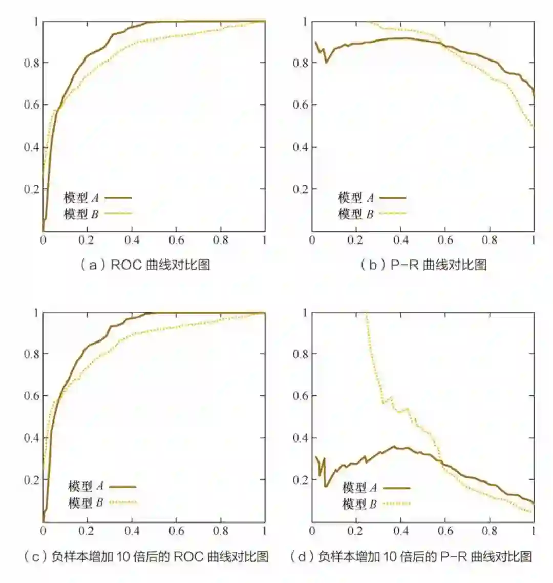 我们可以看到不同召回率下模型 A 和模型 B 的精确率表现不同,所以如果只对某点来衡量模型的性能是非常片面的,而只有通过 P-R 曲线的整体表现才能够进行更为全面的评估。