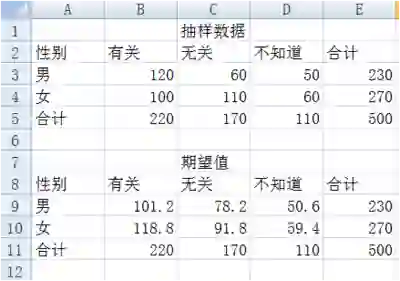 求解男女对收入与性别相关不同看法的期望次数,这里采用所在行列的合计值的乘机除以总计值来计算每一个期望值,在单元格 B9 中键入“=B5*E3/E5”,同理求出其他值。