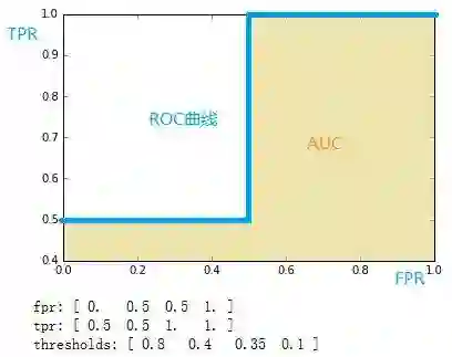 AUC(area under curve):计算从(0, 0)到(1, 1)之间整个ROC曲线一下的整个二维面积,用于衡量二分类问题其机器学习算法性能的泛化能力。其另一种解读方式可以是模型将某个随机正类别样本排列在某个随机负类别样本之上的概率。