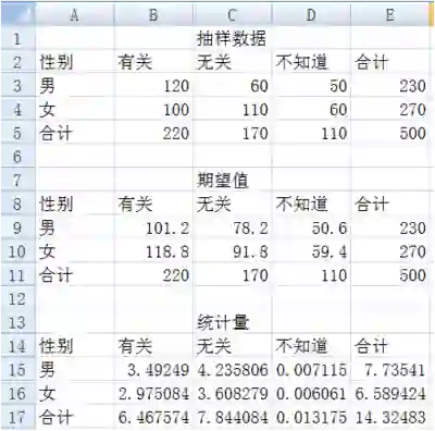 利用卡方统计量计算公式计算统计量,在单元格 B15 中键入 “=(B3-B9)^2/B9”,其余单元格依次类推,结果如下所示: