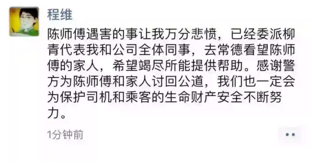 针对3月24日湖南常德一名19岁男孩捅杀滴滴司机的事件,昨日晚,滴滴出行CEO程维发布个人朋友圈,对陈师傅的遇害表示万分悲愤。同时,程维还表示,已经委派滴滴出行总裁柳青代表公司去常德看望陈师傅的家人,希望竭尽所能提供帮助,并感谢警方为陈师傅和家人讨回公道。滴滴早前就常德滴滴司机遇害一事发布声明称,已成立应急处置小组,全力配合警方展开调查并探望和慰问司机师傅家属。