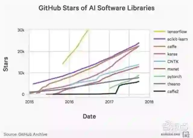 这里主要参考GitHub项目:TensorFlow和 Scikit-Learn等AI和ML(机器学习)软件包被收藏(star)的次数飙升。