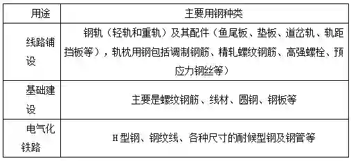 轨道交通用钢主要分为线路铺设用钢、桥梁、隧道和车站等基础设施建设用钢、电气化铁路用钢等。