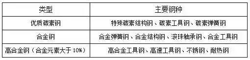 我国将特殊钢分成优质碳素钢、合金钢、高合金钢(合金元素大于10%)三大类,其中合金钢和高合金钢占特殊钢产量的70%。其中碳素钢是指含碳量wc小于2%的铁碳合金,碳钢除含碳外一般还含有少量的硅、锰、硫、磷;合金钢是指合金元素有硅、锰、钼、镍、铬、钒、钛、铌、硼、铅、稀土等其中的一种或几种合金元素的钢。