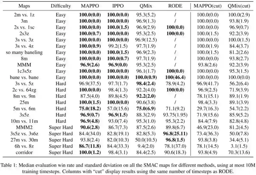 表 1:不同算法在 StarCraftII 的 23 个地图中的胜率对比,其中 cut 标记表示将 MAPPO 和 QMix 截断至与 RODE 相同的步数,目的是为了与 SOTA 算法公平对比。