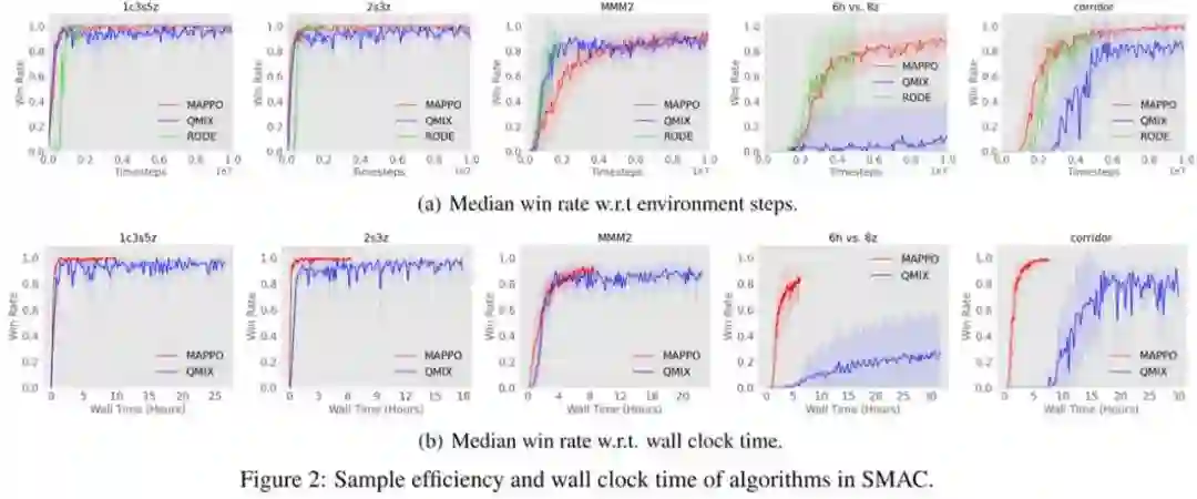 在有限计算资源的条件下,与 off-policy 算法相比,on-policy 算法 --MAPPO(Multi-Agent PPO)具有显著高的算法运行效率和与之相当(甚至更高)的数据样本效率。