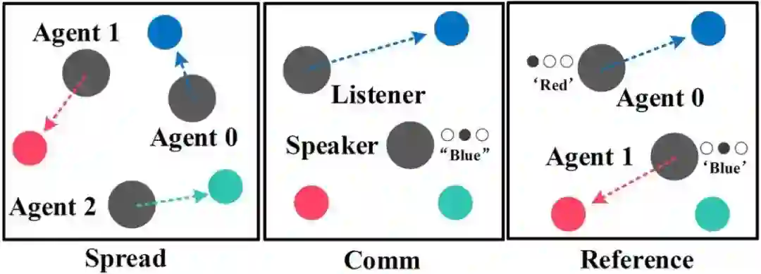 图 1:MPE 环境中的 3 个子任务:Spread,Comm 和 Reference