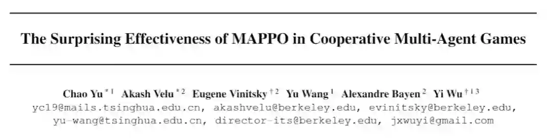 清华和UC伯克利联合研究发现,在不进行任何算法或者网络架构变动的情况下,用 MAPPO(Multi-Agent PPO)在 3 个具有代表性的多智能体任务(Multi-Agent Particle World, StarCraftII, Hanabi)中取得了与 SOTA 算法相当的性能。