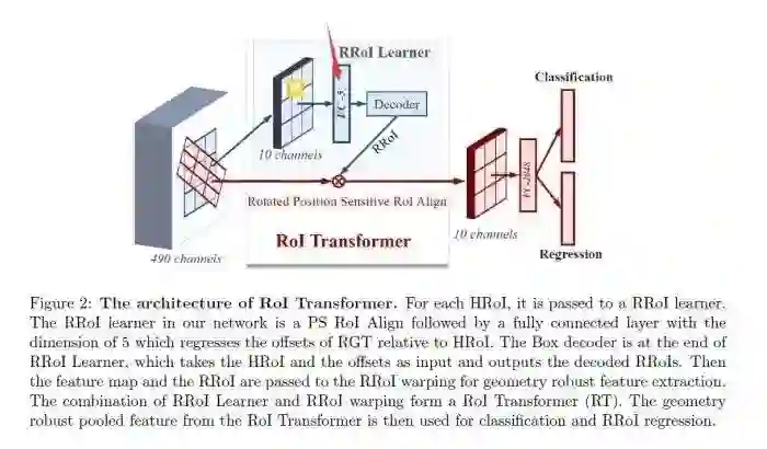 感觉和RRPN比较像,基于旋转anchor,通过RPN得到旋转ROI,基于旋转ROI提取特征,然后进行定位和分类。和Learning roi transformer这篇文章区别 是前者是旋转anchor,后者是水平anchor,计算量更小。