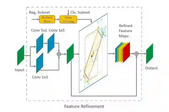 旋转目标检测(水平目标检测也)可能存在某个anchor所在的特征点的感受野和目标位置、形状不匹配 (如下图左上角,绿色框是anchor,它所在的特征点只能看到这艘船的一部分,那么直接用这个点的特征去回归anchor 以拟合ground truth(红色框)不一定准确),所以这篇论文分两个stage:first stage 从anchor预测旋转框(橙色框),如下图红色数字1->2,这时候橙色框范围和真实目标就很接近了,然后根据橙色框提取特征(我理解为类似ROI pooling特征提取),通过这个特征回归到ground truth,如下图中红色数字2->3.