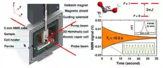 零磁场核磁共振是一个正在快速发展的新领域,它具有许多突出的优势,例如消除了传统核磁共振对超导磁体的依赖性、高分辨率谱学、丰富的自旋动力学等。然而,零磁场核磁共振面临多方面的困难:首先,在零磁场下,核磁共振信号的频率通常小于1 kHz,传统核磁共振的感应探测方法完全失效,探测零磁场核磁共振信号非常困难;其次,零磁场核磁共振由于不同的核自旋的拉莫进动频率为零,因此无法使用选择性脉冲进行操控,如何实现普适的量子控制是亟需解决的难题。
