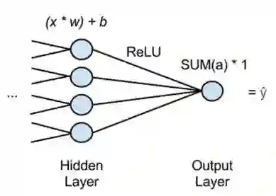 在上图中,“x”是输入,从网络上一层传出的特征。进入最后一层隐藏层的每一个节点,将传递给许多x,并将每个x乘以w,相应的权重。对于偏移,乘积之和将被移动到一个激活函数中。激活函数是ReLU(整流线性单元),它不像Sigmoid函数那样在处理浅层梯度问题时容易饱和。ReLU为每个隐藏节点提供一个输出,激活a,并且激活被添加到通过激活和输出节点中。这意味着,执行回归的神经网络包含单个输出节点,并且该节点将先前层的激活总和乘以1,该网络的估值“y hat”将是结果。“Y”是所有x映射到的因变量。您可以以这种方式使用神经网络来获取与您尝试预测的y(一个因变量)相关的x(自变量)。