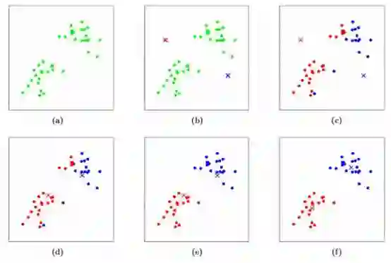 K-means算法——聚类质心被描绘为十字,训练样本被描绘为点。 其中(a)表示原始数据集;(b)表示随机初始聚类中心。(c-f)表示运行2次k-means迭代的演示。每个训练样本在每个迭代中分配给最接近的聚类中心,然后将每个聚类中心移动到分配给它的点的平均值。