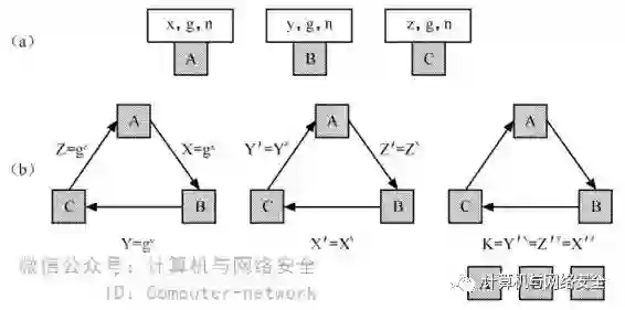 就像我们前面所描述的三个用户的例子那样,Diffie-Hellman算法可以扩展到n个用户组成的一个群体,使用相同的方式执行这个方案。首先,这个群体可设想成已围成一个圆,并以顺时针方向与它紧接着的用户进行通信。如图3(b)所示的环操作就要进行 n-1 次。在每次迭代中,根据上一次从相邻用户那接收到的值,以各自私有值的为指数计算,将结果再传送给下一个相邻用户。