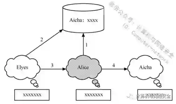 现在假设某种情况中,该团体中的两个成员,Elyes和Aicha希望她们之间建立一条安全通道。Elyes从公钥库里寻找Aicha的公钥,然后用它加密数据并把加过密的消息发送给Aicha。现在假设另外一个成员,Alice想在这条通信通道上进行窃听,如图8所示。首先,在这一安全通道建立之前,Alice把公钥库里的Aicha的公钥替换成她自己的公钥,然后,在第二步中,Elyes以为她找到的是Aicha的公钥,而实际上,这是Alice的公钥。第三步,Elyes 用在第二步获得的公钥对信息包进行加密然后发送给 Aicha。第四步,Alice拦截了信息包,并用她的密钥成功地破解了信息包,阅读了信息后,再使用Aicha的公钥对信息再加密,然后发送。最后,Aicha 接收到信息包,用她的密钥进行解密,但是这个信息包已经被偷看。