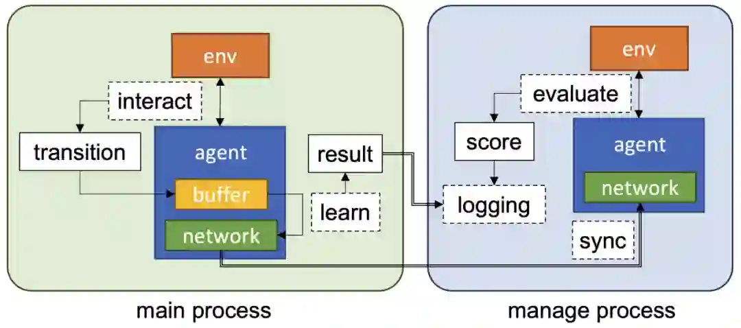 单个参与者训练脚本中包含主进程和管理进程。在主进程中,单个智能体与环境交互以收集转移(transition)数据,并借助这些数据训练网络。在管理进程中,使用最新的网络进行评估得到一个分数,并在主进程中记录这个分数和训练结果。训练流程如下图所示: