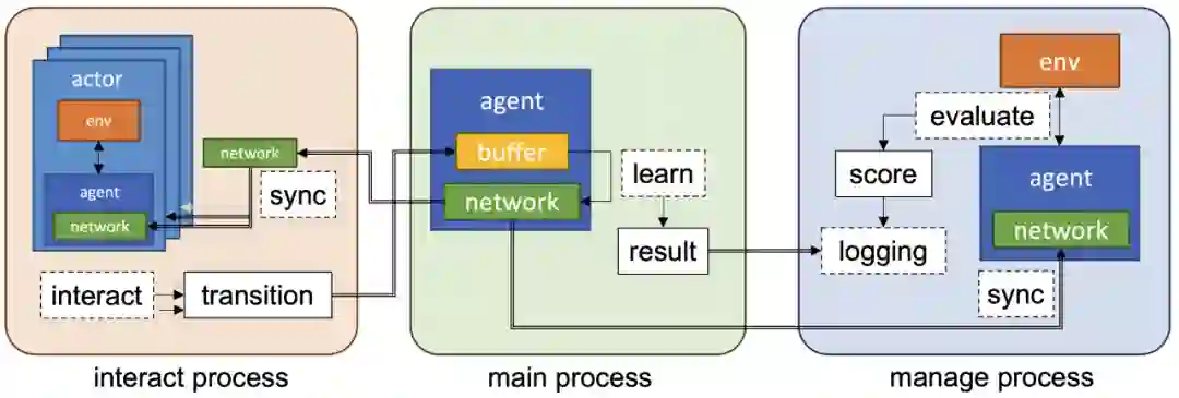 为了实现分布式强化学习,该项目使用 ray(允许参与者并行交互)和多进程,支持单个参与者(actor)训练、同步分布式训练和异步分布式训练。