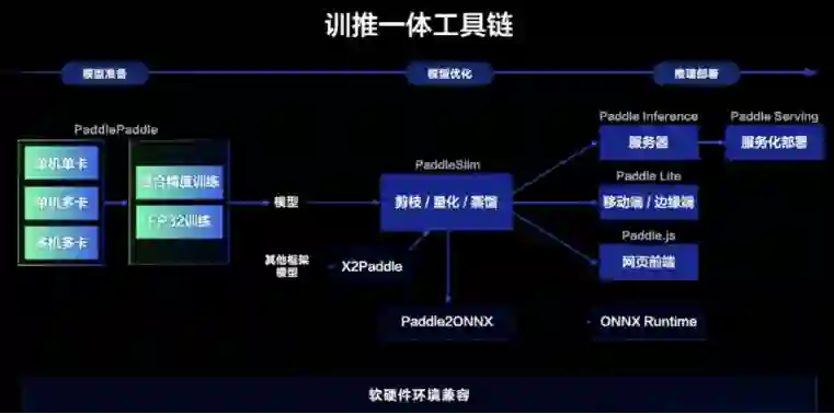 与训推一体导航图配套的还有训推一体工具链。不但可以方便的基于飞桨生态完成模型的高性能训练、模型压缩、部署乃至前端展示全流程,而且支持将其他框架下研发的模型通过X2Paddle工具完成到该工具链的接入,实现了对不同来源模型做统一的软硬件环境兼容。