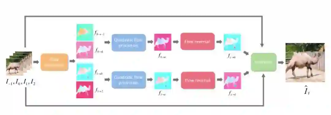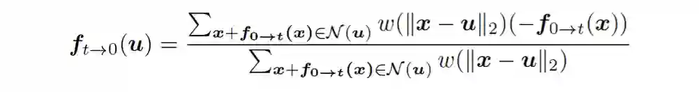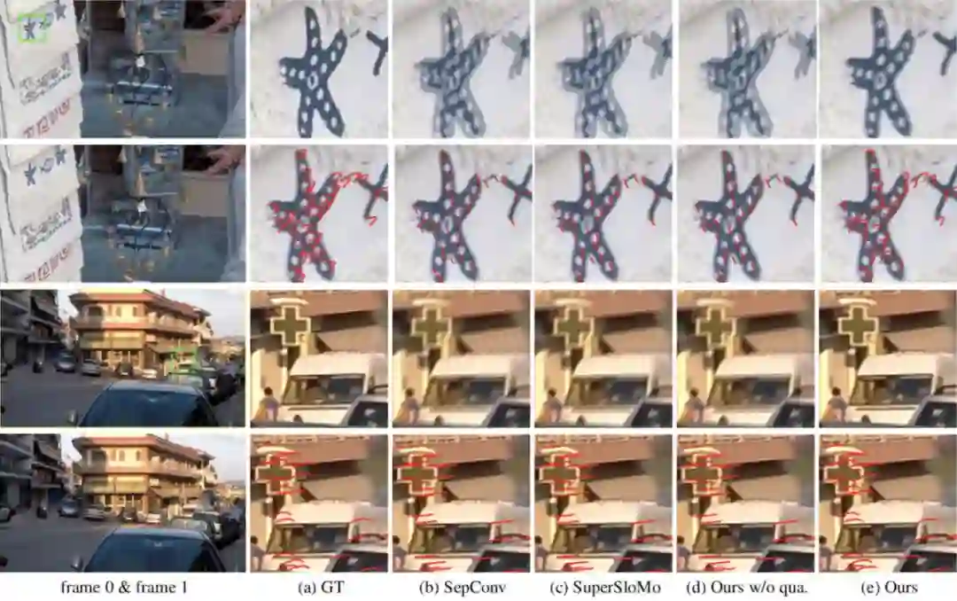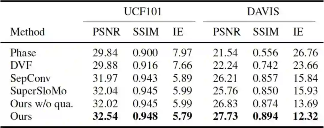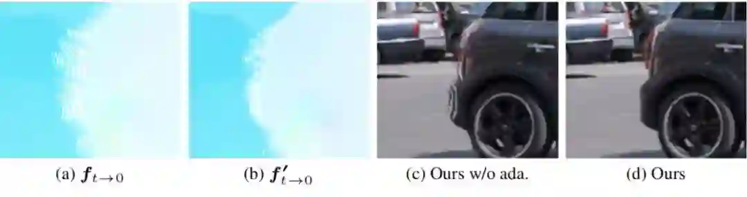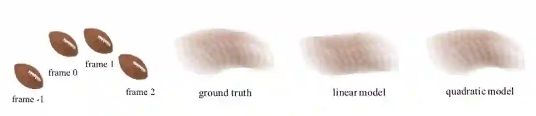 图2 二次方插帧模型的流程 、、 和是输入视频连续的四帧。给定任意时刻t(0<t<1),该模型将最终生成t时刻的中间帧。而要得到,就需要更深入了解其中的两个关键技术:二次方光流预测和光流逆转。其中,二次方光流预测,就是中学物里面常讲到的求匀变速运动位移的过程:假设在[-1, 1]时刻的运动是匀加速运动,那么可以利用位移推测出0时刻的速度和区间内的加速度,即可以计算出0时刻到任意t时刻的位移:图3:视频中物体运动的示意图,,,分别表示物体,,, 中的位置通过以上方法,对称地我们可以计算出。此时,我们得到了含有加速度信息和。为了生成高质量的中间帧,我们需要得到反向光流和。为此研究团队提出一个可微分的“光流逆转层”来预测和。通过以下转换公式可以高效的将和和转化为和,但是可能会造成逆转的光流在运动边界处出现强烈的振铃效应(见图4)。为了消除这些强烈震荡的部分,研究团队提出了一种基于深度神经网络的、能够对逆转后光流进行自适应采样的滤波器(Adaptive Flow Filter)。实验证明,自适应滤波器(ada.)能够明显削弱光流逆转造成的振铃效应,从而改善最终合成帧的质量。图4 自适应滤波器能够改善逆转的光流和合成的中间帧的质量 实验结果 研究团队在GOPRO、Adobe240、UCF101和DAVIS四个知名视频数据集上对提出的方法进行测评,并与业界前沿的插帧方法Phase、DVF、SepConv和SuperSloMo进行比较。在每个数据集上,二次视频插针方法都大幅超过现有的方法(见表1、表2)。表1 本文提出的方法和业界前沿方法在GOPRO和Adobe240数据集上的比较表2 本文提出的方法和业界前沿方法在UCF101和DAVIS数据集上的比较除此之外,研究团队还对各种方法生成中间帧进行了关键点跟踪并进行可视化,从图5中两个案例的视频运动轨迹可以看出,用真实慢动作相机采集的中间帧(GT)的运动轨迹是曲线的。线性模型(SepConv、SuperSloMo、Oursw/o qua)生成的中间帧的运动轨迹都是直线,相反,本文的模型(Ours)能够更精准的预测出非线性轨迹,获得更好的插帧结果。图5 对不同方法的插帧结果进行可视化。第一行和第三行是每种方法的插帧结果和真实图像中间帧(GT)的平均。第二行和第四行对每种方法的插帧结果进行关键点跟踪。 综上,本文提出的能够感知视频中运动加速度的插帧方法相比已有的线性插帧算法,能够过更好地预测中间帧。 [1]S.Meyer, O.Wang, H.Zimmer, M.Grosse, and A.Sorkine-Hornung. Phase-based frame interpolation for video.In CVPR, 2015[2]Z.Liu,R.Yeh, X.Tang, Y.Liu, and A.Agarwala. Video frame synthesis using deepvoxel flow. In ICCV,2017.[3]S.Niklaus, L.Mai, and F.Liu. Video frame interpolationvia adaptive separable convolution. In ICCV,2017[4] H.Jiang, D.Sun, V.Jampani, M.Yang, E. G. Learned-Miller, and J.Kautz. Superslomo: High quality estimation of multiple intermediate frames for video interpolation. In CVPR, 2018. 点击“阅读原文”加入 NeurIPS 交流群