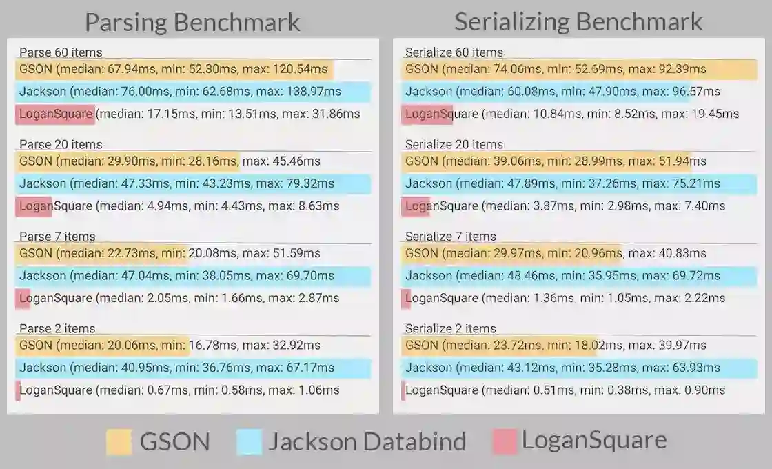 LoganSquare是近两年崛起的快速解析和序列化JSON的Android函数库,其底层基于jackson的streaming API,使用APT(Android Annotation Tool)实现编译时注解,从而提高JSON解析和序列化的性能。官网上可以看到LoganSquare和gson、jackson databind的性能对比。