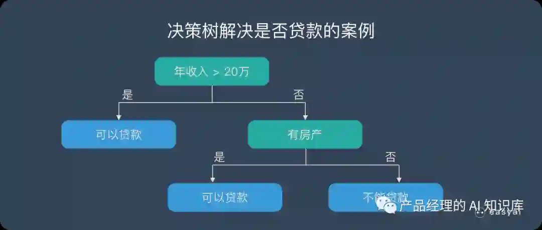 首先判断客户的年收入指标。如果大于20万,可以贷款;否则继续判断。然后判断客户是否有房产。如果有房产,可以贷款;否则不能贷款。