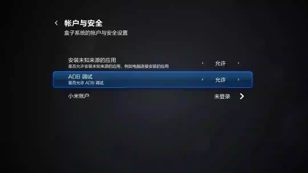 3.盒子的 ADB 开关没有设置为开启。这时候只要进入盒子的设置-安全与隐私将 ADB 调试开关设置为开启即可。就像安卓手机开启 USB 调试那样!
