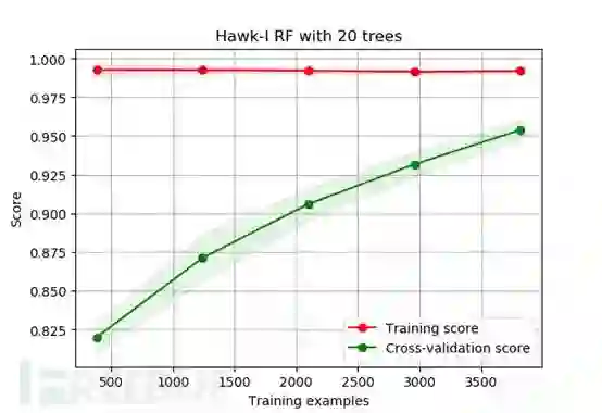这些特征向量能否充分反映样本的异常性呢?我使用未调参的随机森林模型进行验证,得到了大于95%准确率的结果,比较满意。下图是模型学习曲线,可以看出仍处于欠训练的状态,如果样本量更充足的话将会得到更好的效果。
