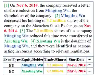 篇章事件抽取问题的挑战包括事件属性分散(EO事件中,“Xiaoting Wu”出现在句子3和句子4中,“Nov 6, 2014”则出现在句子1和句子2中)和多事件(关联性事件“股票增持”和“股票减持”)。现有方法DCFEE、Doc2EDAG等一般独立地抽取事件,忽略它们之间内在关联性。