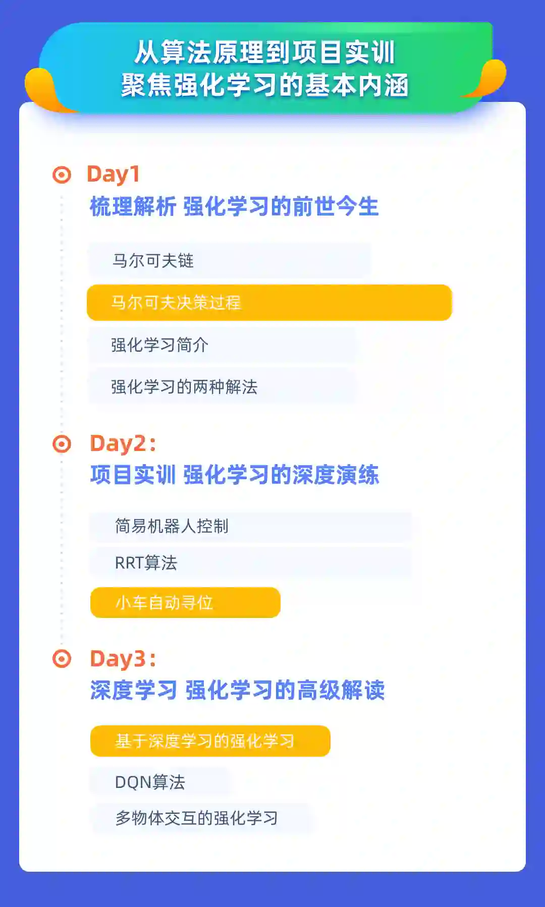 本次训练营为期3天,主要分为三个模块。马尔可夫决策过程及强化学习概念和解法、小车自动寻位项目实训、基于深度学习的多物体交互的强化学习。