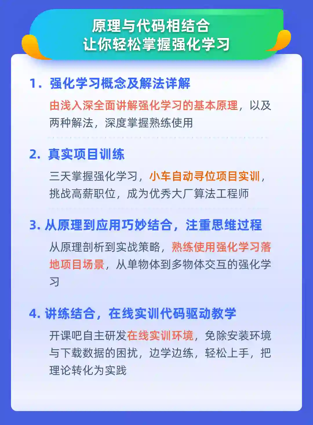 本号强烈推荐你参加《强化学习实战训练营》,开课吧人工智能高级导师深入浅出讲解强化学习,并且结合小车自动寻位项目实训,带你深度掌握多物体交互的强化学习。内容不错,推荐给你们。