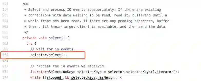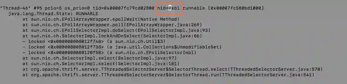 从堆栈信息可以看到触发点位于 Thrift 的 TThreadedSelectorServer.select() 方法中,查看源码可知其不过是调用了JDK Selector.select() 方法。(注:为描述方便笔者把实例方法调用使用类方法调用形式展示)