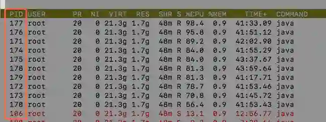 于是赶紧用 top -Hp $PID 查看下所在进程的线程情况,结果如下图: