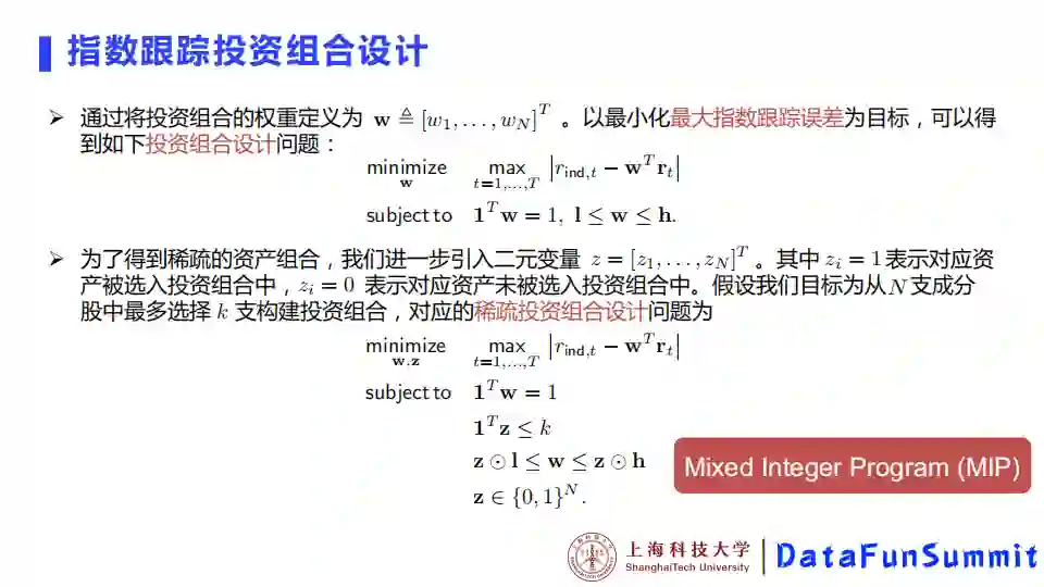 这个就叫做一个混合整数规划问题,看起来比较难一点,并且它的难点不光是这个问题本身比较复杂, 还有n的规模会非常大。比如要对两个市场进行跟踪,那可能就有几千甚至上万只股票。但是k又往往比较小,因为我们总是不希望资产组合中投资太多这样的底层资产。所以对于这样的问题,它的计算复杂度也是非常高。