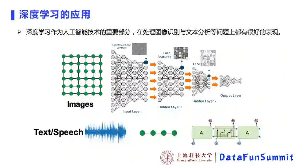 深度学习现在是人工智能非常重要的一部分。比如在图像领域,比较经典的卷积神经网络,它在分析音频领域会有一个基于循环神经网络的LSTM这样的结构,这些都是非常有代表性的深度学习的模型。
