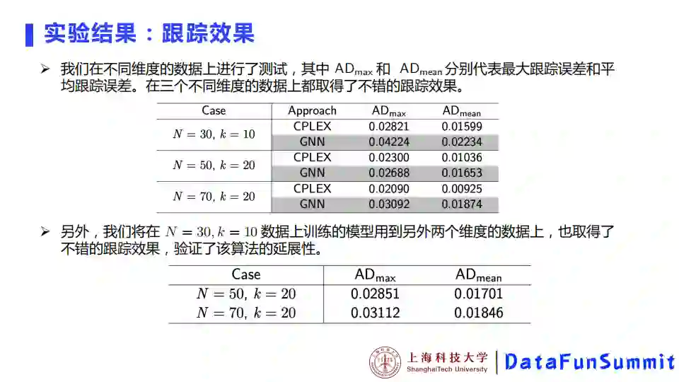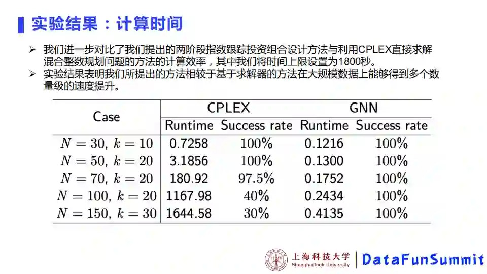 我们通过CPLEX产生的数据训练模型,最后把得到的模型跟业界中应该会用到的CPLEX的模型进行对比。这里用了两个指数跟踪误差,最大的误差和平均误差进行比较。可以看到模型的最后表现跟标准的方法是很接近的。