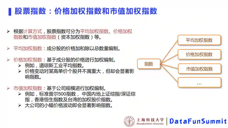 价格加权指数:基于成分股的价格进行加权编制,价格变动对某高单价个股影响不大,却会显著影响整个指数。例如,道琼斯工业平均指数。