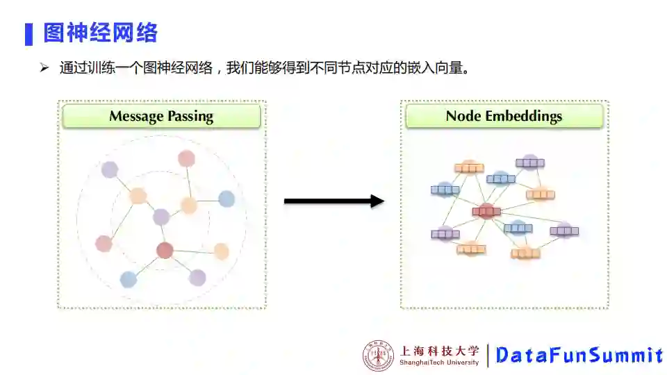 有了这样一个图的表示之后,会得到一个计算图,如图左侧。在这个计算图中,可以通过信息传递得到每个节点的嵌入,节点嵌入其实就是一个向量。