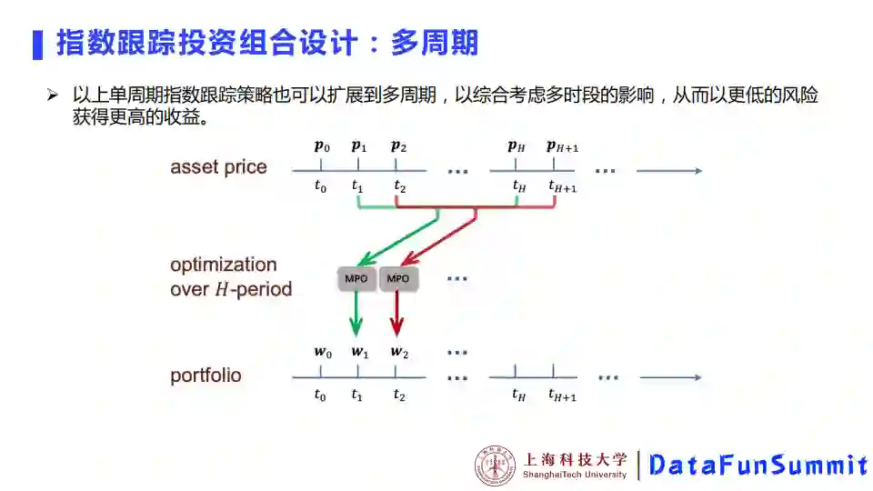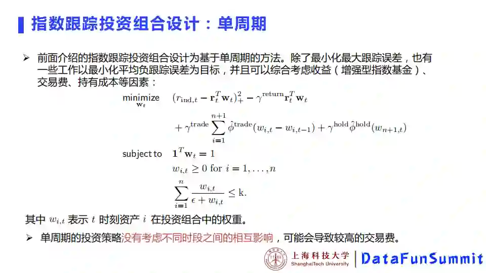 前面讲到的模型其实都是基于单周期的模型。单周期是指在每一个进行投资的时间段内,单独地进行一次指数跟踪基金的设计。但对于不同的投资阶段,需要分别进行设计,因为指数是在不断变化的。所以当从一个阶段到另外一个阶段进行投资的时候,投资比重是需要进行再调整的,最后会导致一个交易成本的问题。所以我们可以把单周期的模型扩展到一个多周期的模型,控制交易费用。