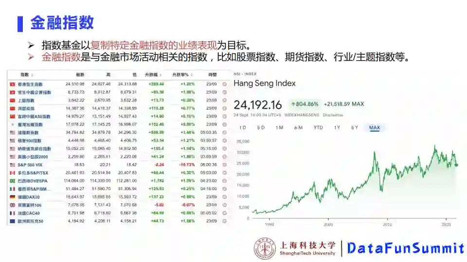 金融指数是与金融市场活动相关的指数,比如股票指数、期货指数、行业/主题指数等。如上图左侧是世界上一些主要指数的列表,图右侧是指数的整体表现,长期来说是呈上升趋势的,即呈现一个正的收益率。