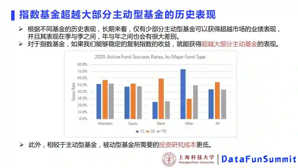 大部分的主动型基金波动性会比较大,当我们回顾历史数据,长期来看主动型基金很难去超越指数基金。这个结果符合有效市场假说,在美国的资本市场可能会更明显一点。